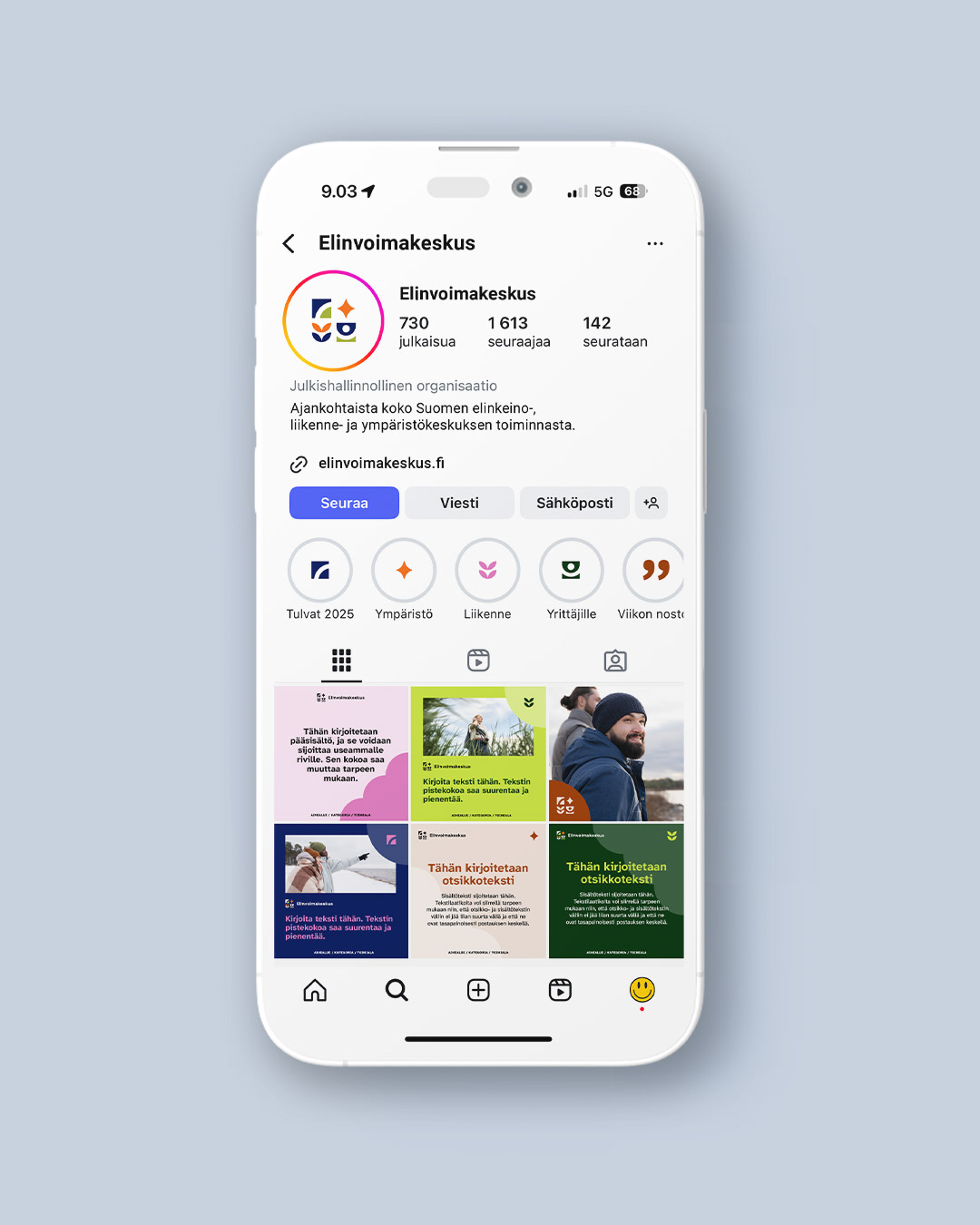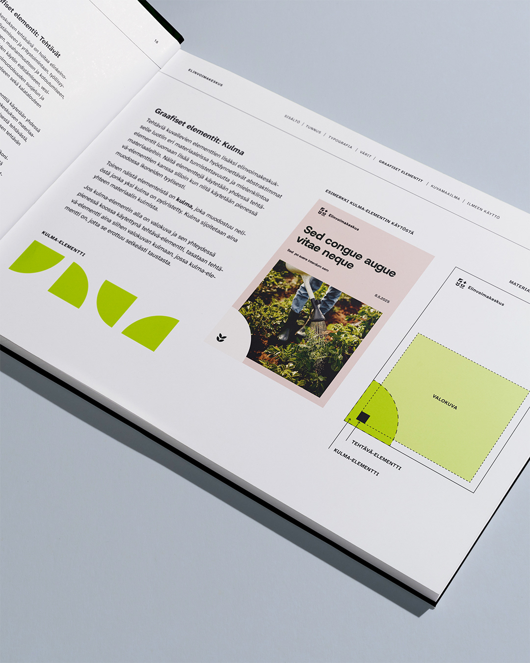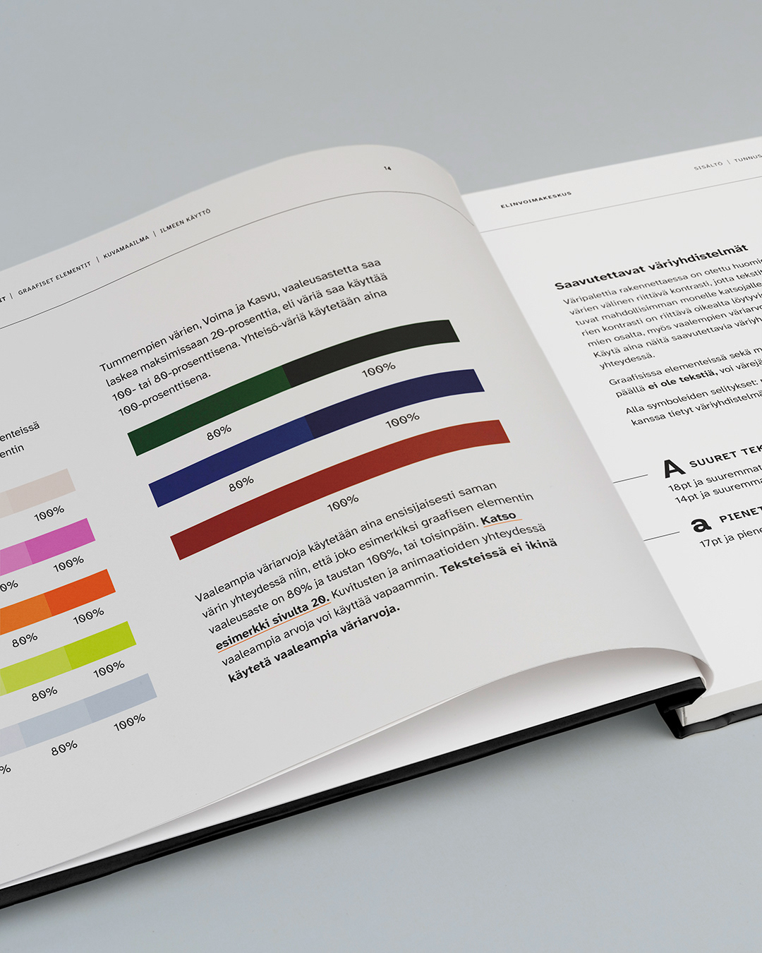Kaikki elementit, materiaalit, tunnukset, typografia ja värimaailma kasattiin yhteen selkeäksi ja kattavaksi graafiseksi ohjeistoksi. Ilme jalkautettiin sosiaalisen median postauksiin, Microsoft PowerPointiin ja Wordiin, esitteisiin, roll-upeihin sekä videoplansseihin, käyntikortteja unohtamatta.