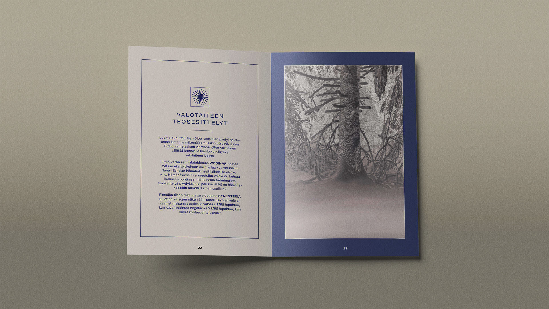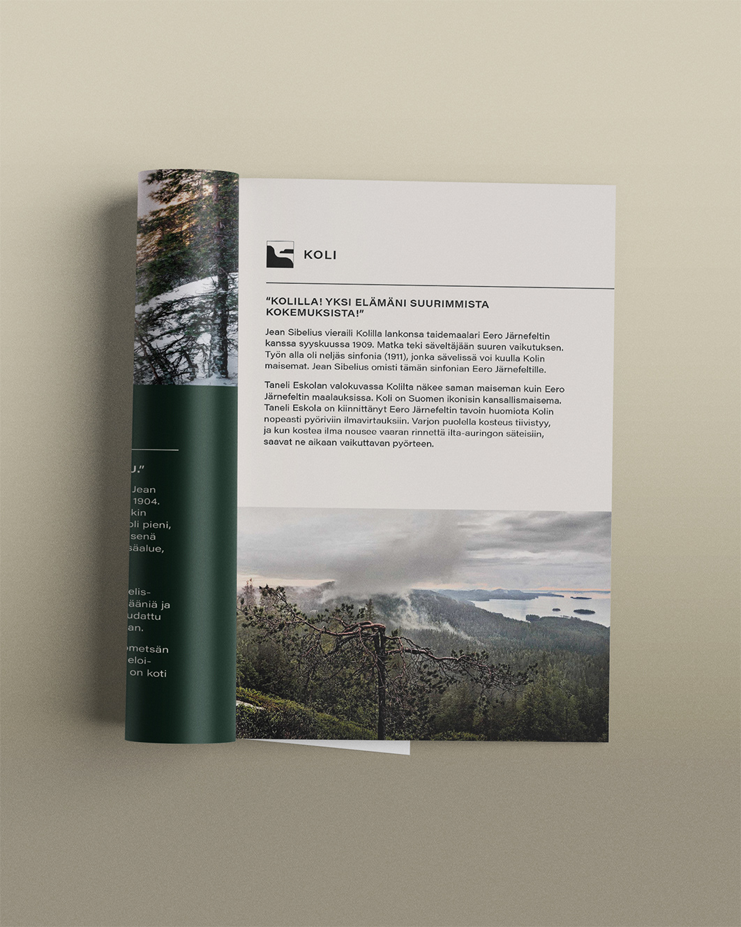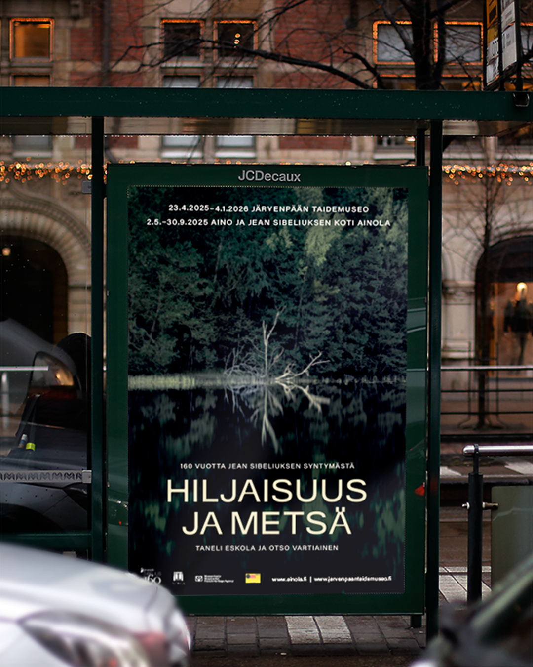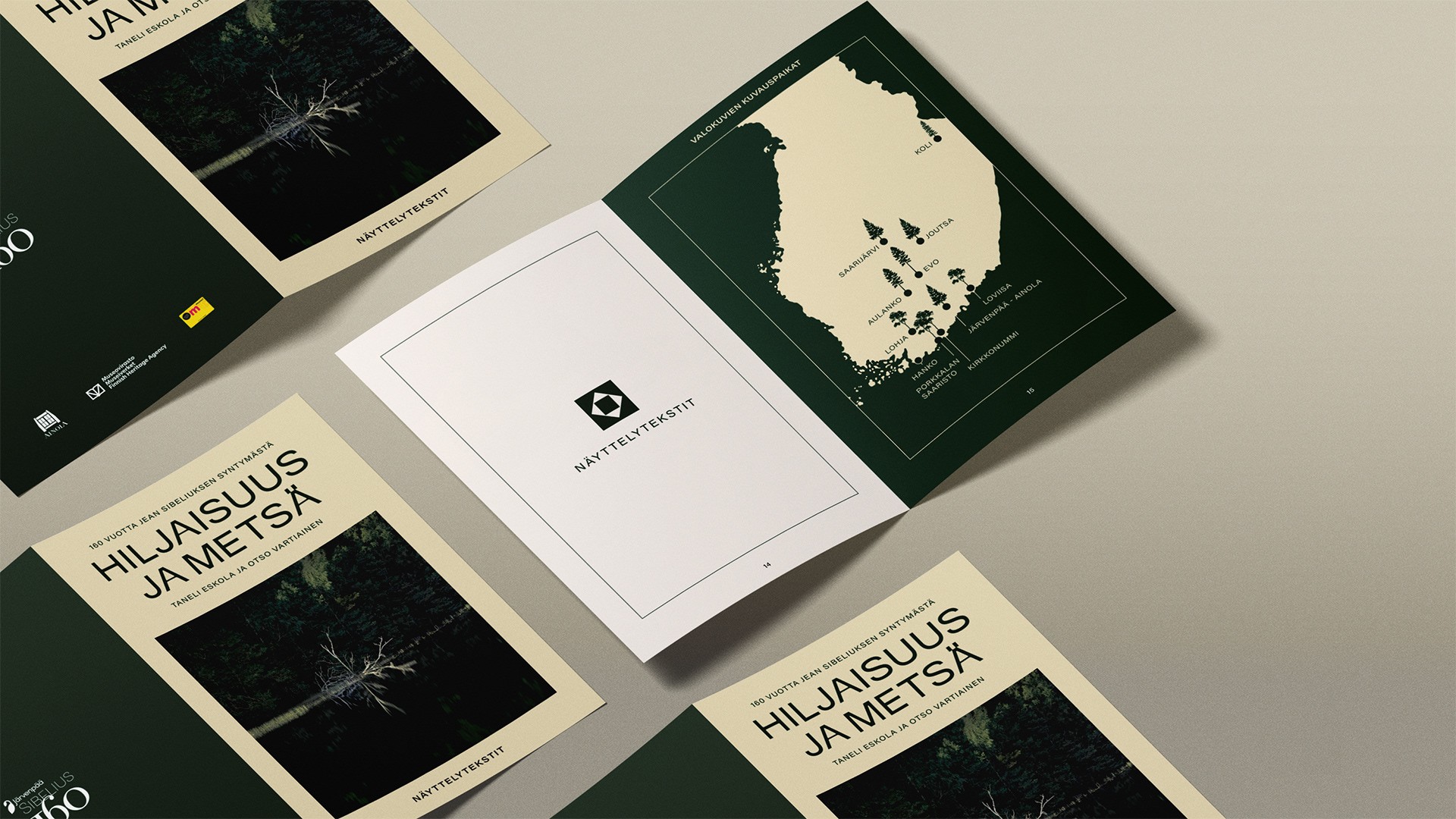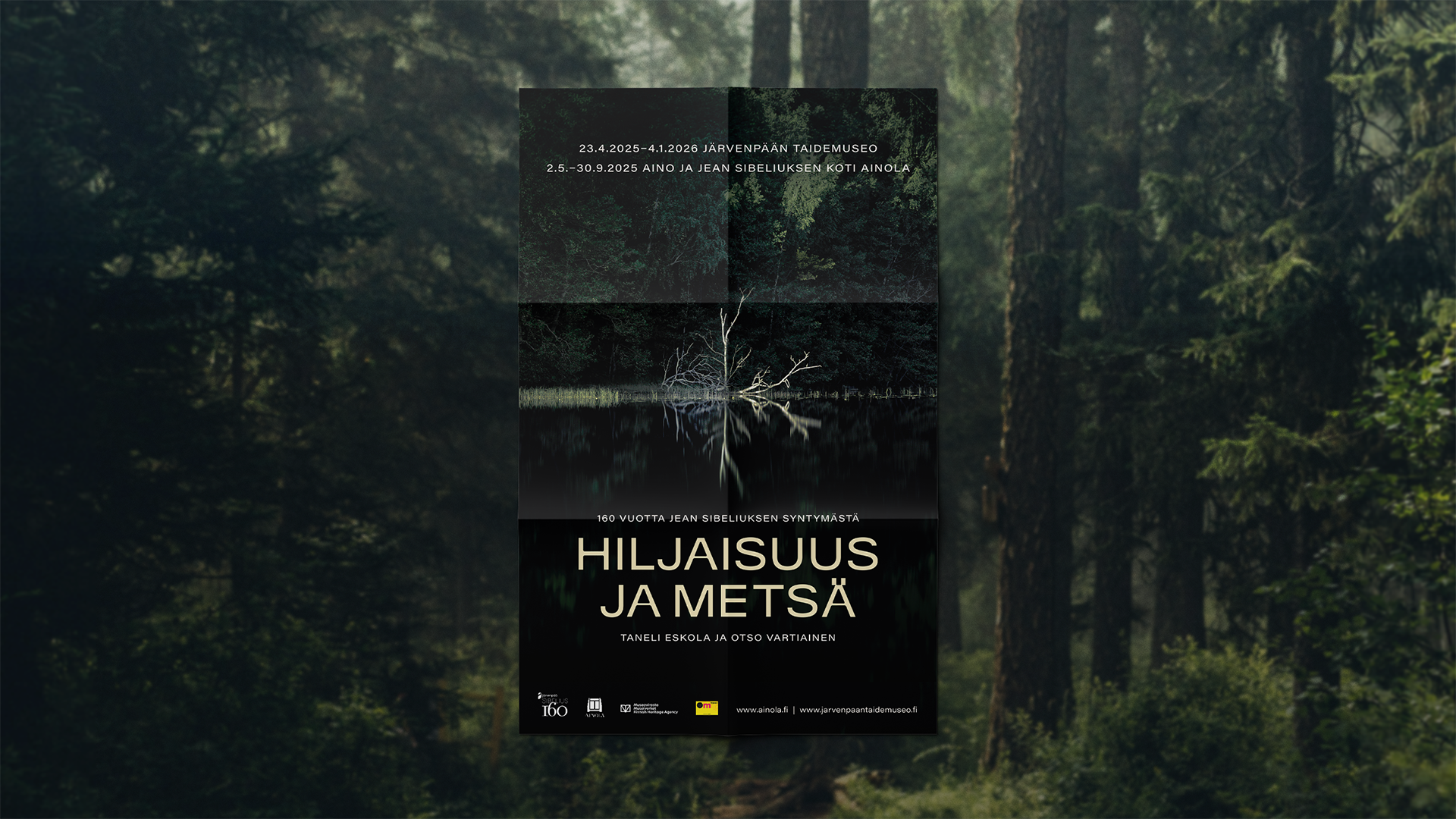 Sain kunniakseni suunnitella kyseisen näyttelyn visuaalisen ilmeen ja tuottaa kaikki tarvittavat materiaalit. Näyttely koostui Taneli Eskolan valokuvista ja Otso Vartiaisen installaatioista. Ilme haluttiin pitää pelkistettynä ja selkeänä – Eskolan pysäyttävä valokuva metsästä nostettiin näyttelyn ilmeen kantavaksi teemaksi, ja sen yhteyteen suunniteltiin minimalistinen otsikointi, jota tukee selkeä ja minimalistinen typografia.