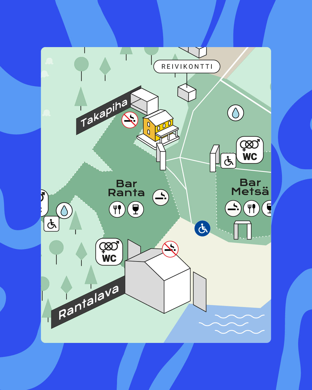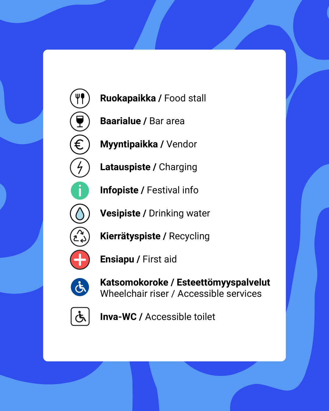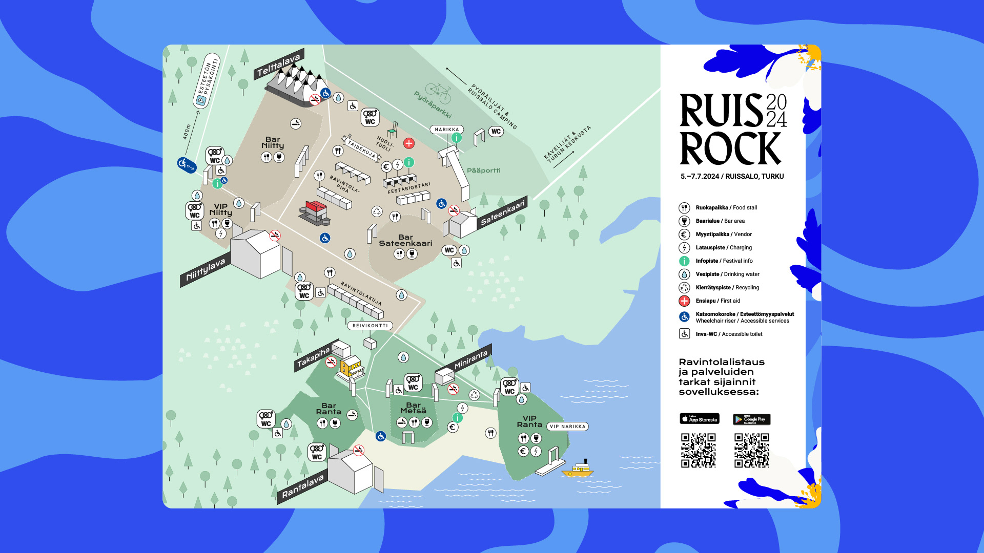 Liikkuvan grafiikan ja digiaineistojen lisäksi puuhailin myös printtimateriaalien parissa. Uudistimme vuoden 2024 festareille aluekartan, päivitin kulkupassien ja ruoka- ja juomalipukkeiden visuaaleja ja taitoin festareiden aikataulun sekä saavutettavuusohjeistuksen.